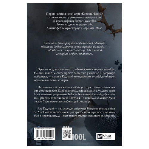 Змія й крила ночі /зі зрізом/., Карісса Бродбент 978-617-17-0720-7 Орея — людське дитинча, прийомна дочка короля вампірів. Єдиний шанс не стати просто здобиччю у світі, де їй загрожує небезпека, — участь у Кеджарі, легендарному турнірі, який проводить сама богиня смерті Перемогти найзапекліших воїнів усіх трьох вампірських домів буде непросто. Щоб вижити, дівчина змушена укласти союз із таємничим суперником. Рейн — безжальний вампір, ефективний убивця, ворог корони її батька. Та найбільше лякає Орею те, що її дивним чином вабить цей поганець. Але Кеджарі — не місце для співчуття. Назріває велика війна за Дім Ночі, й несподівана пристрасть може призвести до загибелі в королівстві, де немає нічого смертоноснішого за кохання.