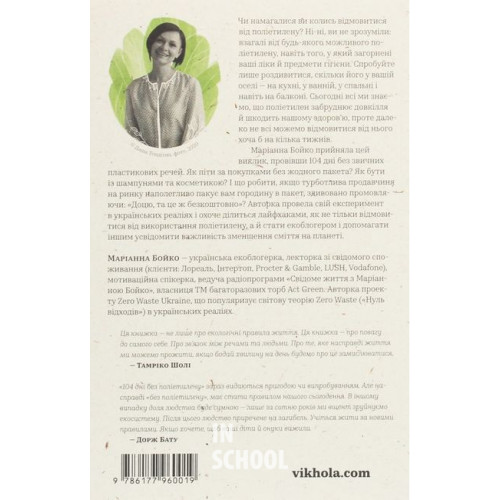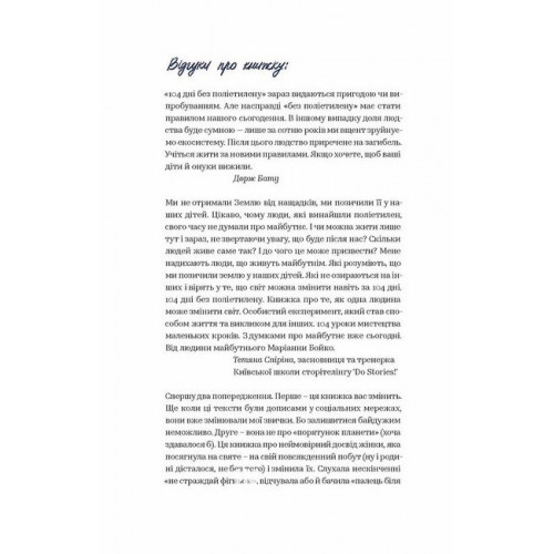 Маріанна Бойко прийняла цей виклик, провівши 104 дні без звичних пластикових речей. Як піти за покупками без жодного пакета? Як бути із шампунями та косметикою? І що робити, якщо турботлива продавчиня на ринку наполегливо пакує вам городину в пакет, здивовано промовляючи: «Доцю, та це ж безкоштовно»? Авторка провела свій експеримент в українських реаліях і охоче ділиться лайфхаками, як не тільки відмовитися від використання поліетилену, а й стати екоблогером і допомагати іншим усвідомити важливість зменшення сміття на планеті.