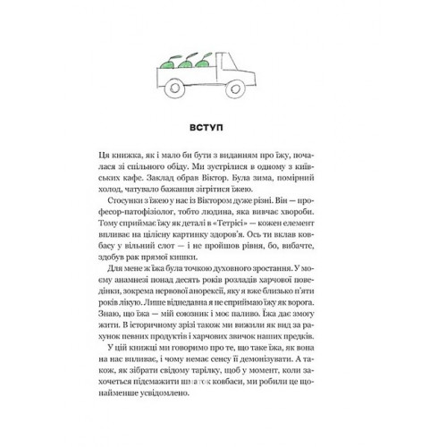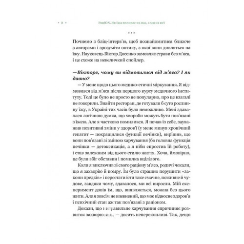 РаціON. Як їжа впливає на нас, а ми на неї., Віктор Досенко 978-617-17-0591-3 Як часто ми раціонально обираємо, що з’їсти? Які продукти допомогли людству вижити у складних умовах? Чому в Україні людей із непереносністю лактози менше, ніж в інших країнах? Чи правда, що людині еволюційно потрібне м’ясо? І де брати білок, якщо від тваринного таки відмовитися?Ця книжка — розмова професора-патофізіолога, який понад двадцять років досліджує хвороби, і редакторки, яка десять років жила з розладами харчової поведінки. Вони обговорили користь і шкоду для організму кожного продукту і «переклали» наукові обґрунтування простими словами.Книга «РаціON. Як їжа впливає на нас, а ми на неї» — це нонфікшн із нутриціології, створений професором-патофізіологом Віктором Досенком і письменницею й редакторкою Іриною Виговською. Видання проілюструвала художниця Маргарита Вінклер.Перед початком роботи над книгою автори поставили собі завдання: не писати сухою академічною мовою й викладати матеріал у легкому стилі без зайвої науковості. Відтак їхнє напрацювання — це не енциклопедичний огляд системи збалансованого харчування, а радше конструктивний діалог між дослідником і людиною, що тривалий час жила з розладами харчової поведінки. Досенко й Виговська говорять про сутність здорового раціону, окреслюють важливість дієти та аргументують, чому не варто демонізувати їжу або ж діаметрально протилежно — шукати в ній розраду.Книгу відкриває інтерв'ю з авторами, що висвітлює їхні позиції щодо харчування й впливу продуктів на організм.Матеріали доповнюють QR-коди, після переходу за якими можна перевірити написане й поглибити знання з конкретної теми.Наприкінці кожного розділу наведено глосарій з поясненням складних слів і термінів.