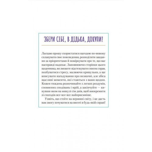 Візьмися вже до справи, трясця! Щоденник, який допоможе досягнути мети., Свіні Моніка 978-966-982-887-3 НАВЧІТЬСЯ ПЛАНУВАТИ СПРАВИ НА КІЛЬКА ДНІВ УПЕРЕД!Завдяки цьому щоденнику ви зможете впорядкувати власні справи, позбавитися розчарування, а також підбити підсумки всьому тому, що йде до біса добре. У ньому ви знайдете підказки, які допоможуть не відволікатися від виконання завдань і взяти звичку обмірковувати свої дії — вам сподобається! На початку кожного тижня ставте цілі й плануйте, як їх досягти, а тоді відстежуйте перелік завдань і позбувайтеся того, що дратує. Коли тиждень добігатиме кінця, у вас буде можливість підбити підсумки всьому, що вдалося зробити. Заповнюючи сторінки, присвячені дням і тижням, ви не втратите мотивації й почуватиметеся героєм. Завдяки цьому щоденнику ви опануєте науку планування і навчитеся позитивного ставлення, що їх так прагнули!