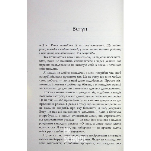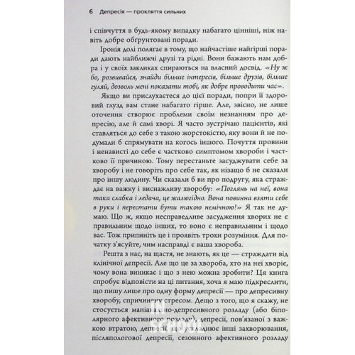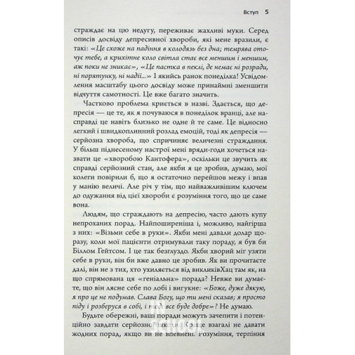 КМ-БУКС Депресія — прокляття сильних. Як боротися з найпоширенишою хворобою в світі. - Тім Кантофер 978-966-948-824-4 Депресія — небезпечна хвороба, і здебільшого тому, що часто недооцінена. Скільки разів людям із депресивним розладом доводилося чути «геніальні» поради на кшталт: «Опануй себе нарешті і просто почни щось робити!»? Та не всім відомо, що це не просто «поганий настрій», а таке саме фізичне захворювання, як і пневмонія чи ангіна, що може виснажувати анітрохи не менше.