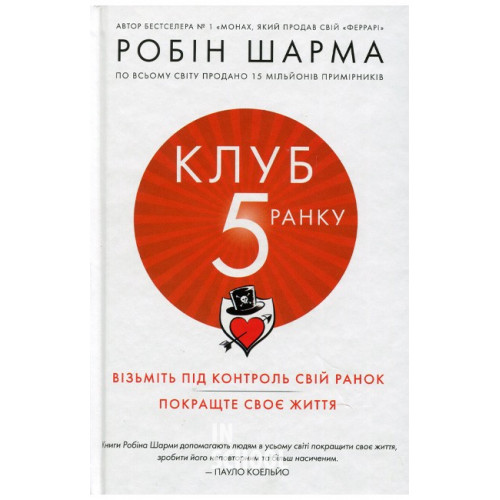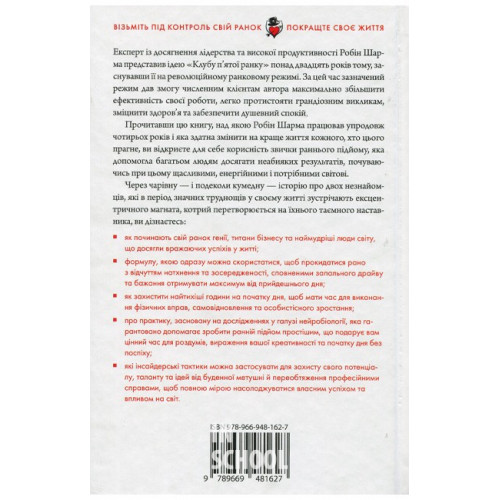 КМ-БУКС Клуб п'ятої ранку. Візьміть свій ранок під контроль, покращте своє життя. - Робін Шарма 978-966-948-162-7 Легендарний експерт із мотивації, лідерства та особистісного зростання Робін Шарма презентує концепцію клубу «5 ранку», засновану на революційній ранковій рутині, яка допомогла його клієнтам максимально підвищити продуктивність, стати здоровішими та знайти спокій у цьому складному й гучному світі. Перед вами чарівна та весела історія про двох незнайомців, які зустрічають ексцентричного магната. Він стає їхнім таємним наставником і знайомить із Клубом 5 ранку.