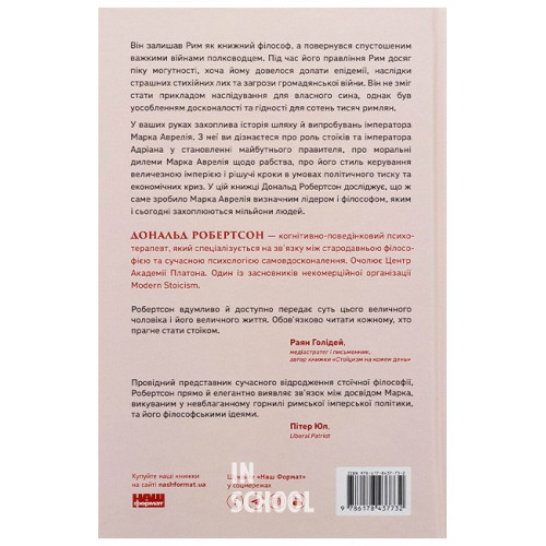 Наш Формат Марк Аврелій. Імператор-стоїк., Дональд Робертсон 978-617-8437-73-2 Познайомтеся зі світом римського імператора Марка Аврелія та величезними випробуваннями, з якими він зіткнувся та які подолав за допомогою філософії стоїків!