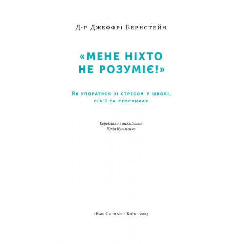 Наш Формат Мене ніхто не розуміє! Як впоратися зі стресом у школі, сім'ї і стосунках., Джеффрі Бернстейн 978-617-7866-90-8 Чи бувало з вами таке, що хочеться влитися в тусовку однолітків, але складно знайти спільну мову? Хочеться прийняття, а батьки тиснуть через оцінки? Хочеться встигати в школі й поза нею, але за навчанням нема коли гуляти з друзями. Думаєте: ну що зі мною не так? Чому мене ніхто не розуміє?