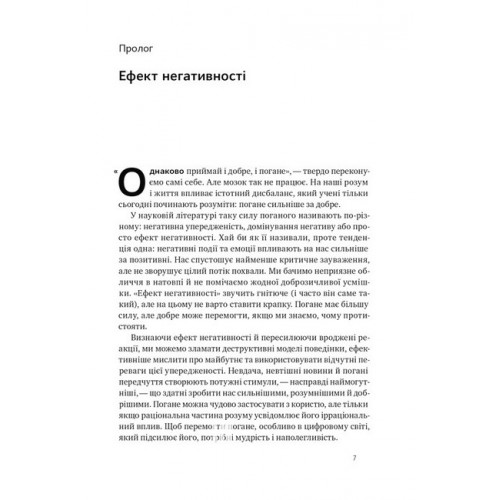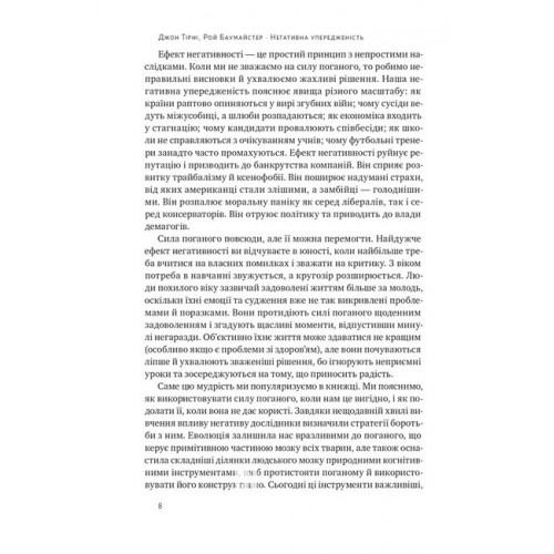 Наш Формат Негативна упередженість. Як її подолати та навчитися керувати своїм життям., Джон Тірні, Рой Баумайстер 978-617-8277-61-1 Чому нас спустошують слова критики, навіть якщо вони змішані зі щедрою похвалою? Тому що наш мозок сконцентрований на поганому. Цей негативний ефект пояснює велике і мале: чому країни впадають у катастрофічні війни, чому пари розлучаються, чому люди пропускають співбесіди на роботу, чому футбольні тренери тупо кидаються на четверте місце. Протягом усього дня сила поганого керує настроєм людей, стимулює маркетингові кампанії та домінує в новинах та політиці.