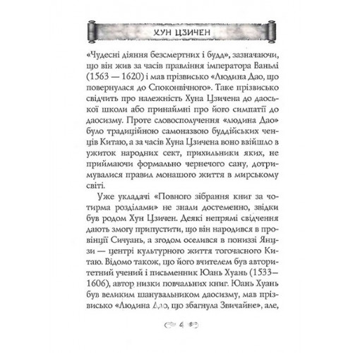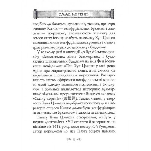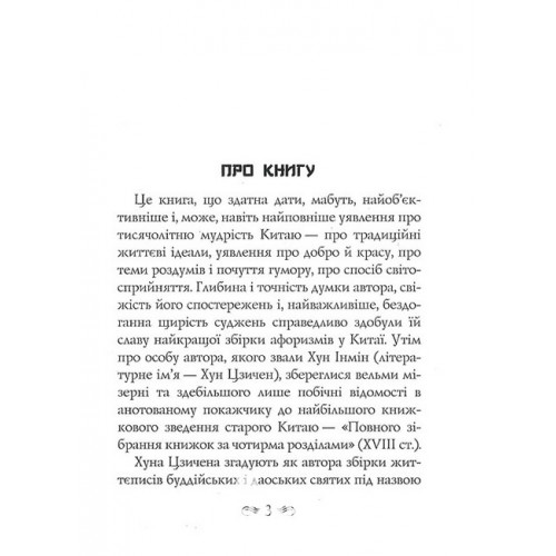 Видавництво "Арій" Смак коренів., Хун Цзичен 978-966-498-819-0 Пропонована книга ознайомлює читача зі скарбницею тисячолітньої мудрості Китаю — традиційними життєвими ідеалами його мешканців, їхніми уявленнями про добро і красу, про систему цінностей і порядку, про спосіб світосприйняття. Відповідно ця збірка мудрих висловів має дуже влучну назву «Смак коренів», тобто, образно кажучи, спрямовує на осягнення сенсу людського життя. Глибина і точність думки її автора Хуна Інміна, більше відомого як Хун Чжицен, свіжість його спостережень і, найважливіше, бездоганна щирість суджень справедливо здобули їй славу найкращої збірки афоризмів у Китаї.