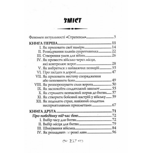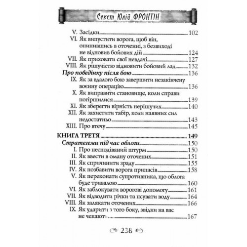 Видавництво "Арій" СТРАТЕГЕМИ., Секст Юлій Фронтін 978-966-498-887-9 У пропонованій праці давньоримського військового та політичного діяча, полководця, вченого і письменника Секста Юлія Фронтіна зібрано та впорядковано зразки майстерних тактичних і психологічних прийомів, успішних рішень і діянь римських і грецьких полководців, правителів і воєначальників. Ці прийоми названо «воєнними хитрощами», адже вони не були обдумані заздалегідь у ході стратегічного планування, а були застосовані через раптові несприятливі обставини, щоб уникнути їх або навіть обернути собі на користь.
