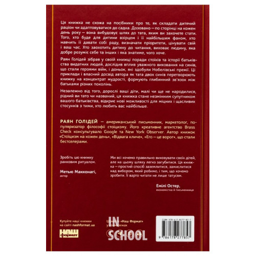 Наш Формат Татові на щодень. 366 роздумів про батьківство, любов і виховання дітей., Раян Голідей 978-617-8277-85-7 Ця книжка не схожа на посібники про те, як складати дитячий раціон чи адаптовуватися до садка. Дозовано — по сторінці на кожен день року — вона вибудовує шлях до тата, яким ви захочете стати. Того, хто буде для дитини взірцем і її найбільшим фаном, хто навчить її давати собі раду, визначати пріоритети, цінувати свій і ваш час. Хто заохотить дитину до читання, виховає людину, яка добре розуміє себе та інших, і яка знатиме, чого хоче.