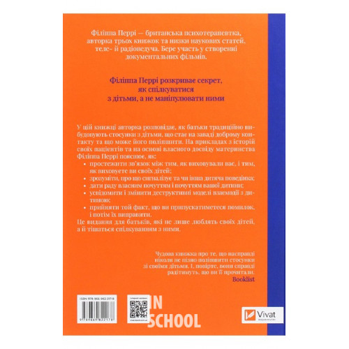 Важливо щоб ваші батьки прочитали цю книжку(а ваші діти радітимуть якщо і ви це зробите)., Філіппа Перрі 978-966-982-217-8 Це видання змінить ваше уявлення про комунікацію з дитиною, і ви зможете по-новому поглянути на досвід батьківства. Як установити міцний духовний зв’язок з малюком від моменту його народження? Книжка починається із заклику проаналізувати стосунки зі своїми батьками. Мало хто мав ідеальне дитинство, і є певні травми, які всі ми боїмося передати дітям. Авторка допомагає пропрацювати цей аспект, перш ніж переходити до навичок здорового батьківства. Як навчитися контролювати свої емоції, розуміти причини дитячих переживань, створювати умови, сприятливі для розвитку дитини, навіть якщо ви виховуєте її в неповній сім’ї — усе це, та багато інших корисних вказівок ви знайдете на сторінках цієї книжки.Авторка пропонує комплексний підхід до процесу виховання, а не окремі поради й лайфхаки. Цей підхід стосується всього: сприйняття дитини, пропрацювання власних психологічних травм і бар’єрів та усвідомлення того, що їх не варто нав’язувати й передавати дитині. А ще в книжці подано вправи та завдання, які зміцнять стосунки з дитиною і допоможуть вам краще зрозуміти її.