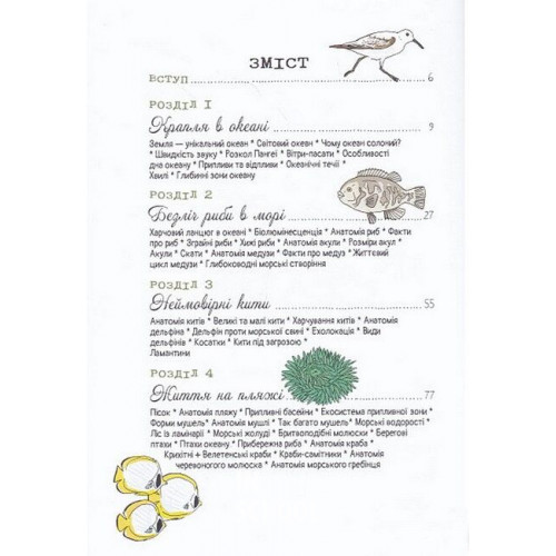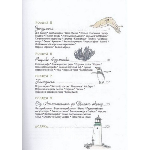 Книга допоможе дітям поринути у дива океанів та дізнатися як вони утворилися. Гортаючи сторінки, юні читачі (а, можливо, і дорослі) отримають відповіді на найцікавіші питання: чому море солоне, як живуть кити, яка тварина в океані найбільша, чим відрізняються види дельфінів, що таке коралові рифи, які морські кораблі існують і безліч інших.