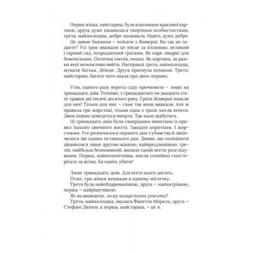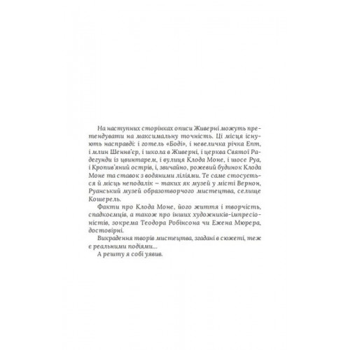 Чорні водяні лілії., Бюссі Мішель 978-617-17-0284-4 У Живерні, улюбленому містечку Клода Моне, зазвичай тихому і спокійному, сталося вбивство… В основі сюжету — життя трьох жінок: дівчинки-художниці, молодої чарівної вчительки й старенької пані, яка бачить і знає все. Усі троє геть різні, проте їх об’єднує одна таємниця: вони мріють назавжди поїхати звідси. Та чи так легко покинути свою золоту клітку? До того ж містечком ширяться чутки про викрадені картини Моне, серед яких нібито має бути відоме полотно — «Водяні лілії» в чорних тонах. І на тлі всього цього вирує руйнівна пристрасть…