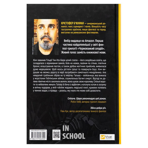 Чорноязикий злодій., Крістофер Б’юлман 978-617-17-0639-2 Книга «Чорноязикий злодій» — це темне фентезі від американського письменника Крістофера Б'юлмана.Для Кінча На Шаннака бути грабіжником — справжнісіньке мистецтво, тому чоловік здобував злодійську освіту: його натренували правильно битися, плести інтриги й розставляти хитрі пастки. Герой винен своїм учителям за навчання та змушений виконувати їхні накази, поки не сплатить борг. Шаннак зачаївся в нетрях лісового гостинця: він чекає на мандрівника, з якого витрусить усі цінні речі. Одначе розбійник не передбачив, що його наступній жертві під силу дати собі ради.