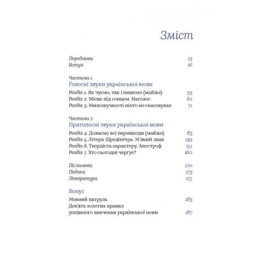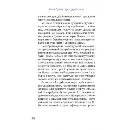Віхола Чути українською. У світі звукі і букв., Ольга Дубчак 978-617-7960-07-1 Чи знаєте ви, що голосних в українській мові приблизно в п’ять разів менше, ніж приголосних? Чи чули ви про нескладотворчі звуки? А про літеру Шредінгера? Чи відомо вам, що шиплячі постійно мімікрують під інші приголосні української мови? Якщо чесно: ви все це знаєте. І навіть якщо вам здається, що ви гадки не маєте, за яким принципом слід вимовляти ті чи інші звуки, ваші мовна свідомість і мовленнєвий апарат роблять це бездоганно.