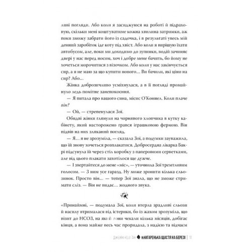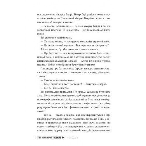 Рідна мова Книгаренька щастя на березі., Дженнi Колґан 978-617-8512-50-7 Зневірена мати-одиначка Зої хоче поїхати з Лондона й побудувати нове життя для себе та сина Гарі. Вона ледве сплачує за квартиру-студію на жвавій вулиці, де гудіння клаксонів і крики футбольних фанатів не дають спати. Якщо Зої скоро не знайде виходу — у неї станеться нервовий зрив. Тому вона влаштовується нянею в Шотландію, далеко від метушливого Лондона. Звучить неймовірно!