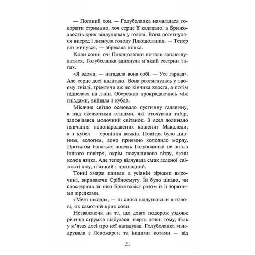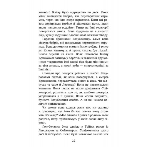 Коти - вояки. Знамення Зореклану. Книга 2. Стихле відлуння, Ерін Гантер 978-617-8229-93-1 Друга книга четвертого циклу «Знамення Зореклану» серії світового бестселера «Коти-вояки».Трійка обраних нарешті зібралася. Але призначення кожного ще невідоме.Після того, як спільному вояцькому патрулю вдалося повернути воду, що зникла через збудовану бобрами плотину, й подолати посуху, життя Громового Клану, здавалося б, теж увійшло у свої береги. Але природа знову випробовує мешканців Громового табору на міцність. До того ж одного з новаків уві сні починає навідувати таємничий гість. Що саме він обіцяє та чи дійсно все так, як каже? І хто він, друг чи ворог?