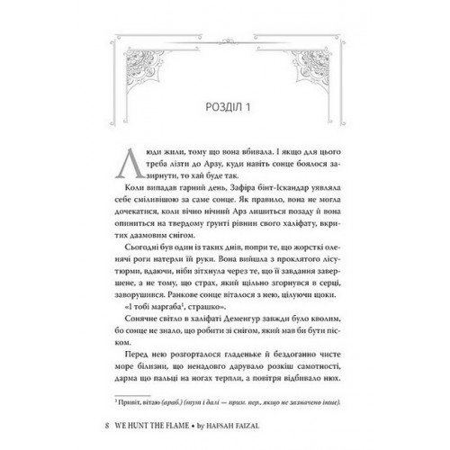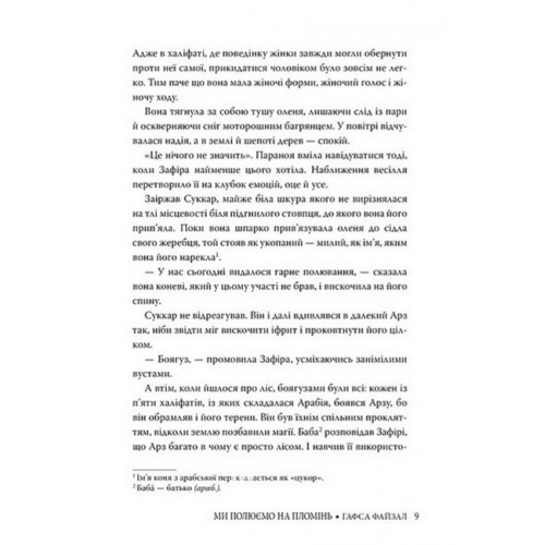 Рідна мова Ми полюємо на пломінь., Гафса Файзал 978-617-8373-94-8 Зафіра — Мисливець і, маскуючись під чоловіка, сміливо йде до проклятого лісу Арзу, щоб годувати своїх людей. Насір — Принц Смерті, що вбиває тих, кому стає дурості опиратися його деспотичному батькові, султану. Якщо Зафіру викриють як дівчину, всіма її досягненнями знехтують; якщо Насір виявить співчутливість, батько піддасть його найжорстокішим карам. І Зафіра, й Насір — легенди в королівстві Арабія, та не хочуть ними бути.
