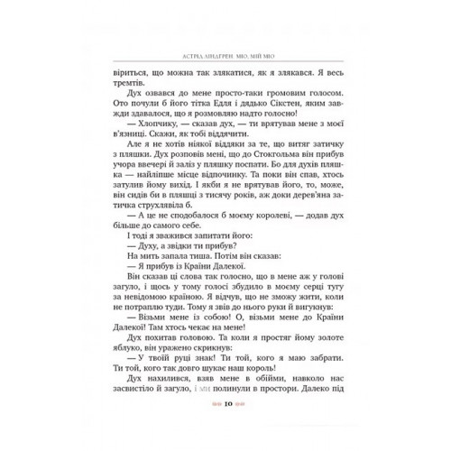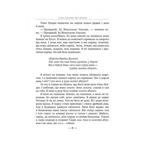 Рідна мова Міо, мій Міо!., Астрід Ліндґрен 978-617-8280-88-8 В одній із найзнаменитіших повістей класика шведської та світової літератури. Астрід Ліндґрен розповідається про дивовижні пригоди юного героя — хлопчика Міо, про одвічну боротьбу добра і зла, втіленого в особі лиходія Като, про дружбу та взаємовиручку дітей, які не розгубилися, а згуртувалися у спільній боротьбі зі злом. Добро, як завжди, перемагає. За мотивами повісті знято знаменитий однойменний фільм (1987).