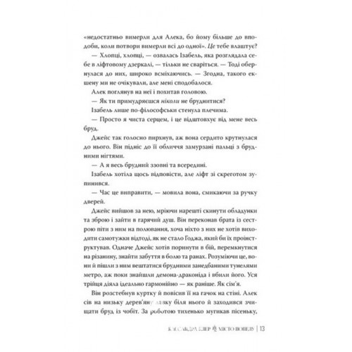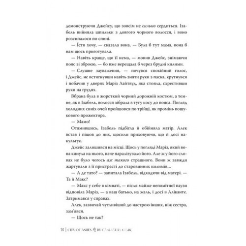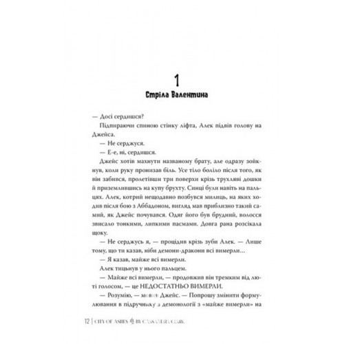 Рідна мова Місто Попелу., Кассандра Клер 978-617-8426-82-8 Найбільше бажання Клері Фрей — повернутися до нормального життя. А втім, хіба може бути нормальним хоча б щось, коли ти, виявляється, належиш до клану тіньових мисливців на демонів, твоя мати впала в магічну кому, а тебе з усіх боків оточують вовкулаки, вампіри, фейрі та інші нижньосвітці? До того ж єдиний шанс Клері врятувати маму — знайти Валентина: імовірно, божевільного та, безсумнівно, лихого відступника, який, за збігом обставин, ще й доводиться їй батьком. Та й стосунки з Джейсом і Саймоном стають дедалі заплутанішими.