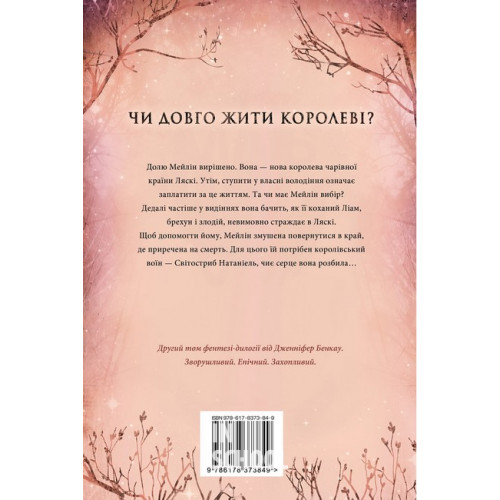 Рідна мова Одна істинна королева. Зіткана з тіні., Дженніфер Бенкау 978-617-8373-84-9 Долю Мейлін вирішено. Вона — нова королева чарівної країни Ляскі. Утім, ступити у власні володіння означає заплатити за це життям. Та чи має Мейлін вибір? Дедалі частіше у видіннях вона бачить, як її коханий Ліам, брехун і злодій, невимовно страждає в Ляскі. Щоб допомогти йому, Мейлін змушена повернутися в край, де приречена на смерть. Для цього їй потрібен королівський воїн — Світостриб Натаніель, чиє серце вона розбила…