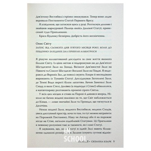 День за днем він чітко й сумлінно фіксує у своїх зошитах дива Будинку: лабіринт зал, незчисленні тисячі статуй, припливи, що з гуркотом підіймаються сходами, хмари, що поволі снують горішніми залами.