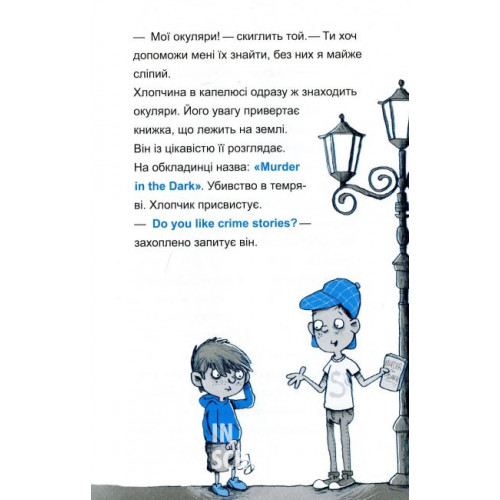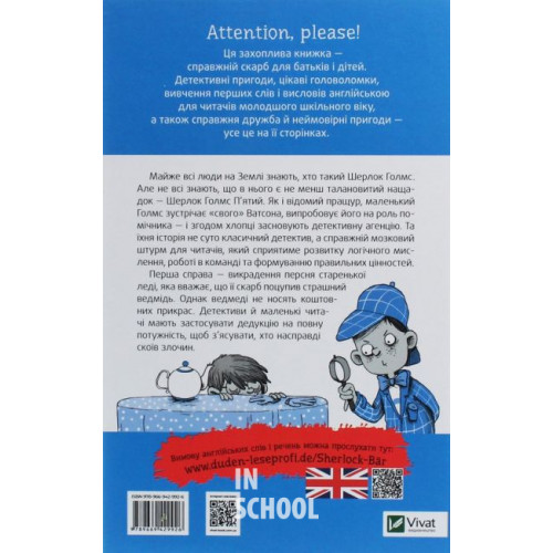 Шерлок молодший і лондонський ведмідь., THiLO 978-966-942-992-6 Ця захоплива книжка — справжній скарб для батьків і дітей. Детективні пригоди, цікаві головоломки, вивчення перших слів і висловів англійською для читачів молодшого шкільного віку, а також справжня дружба й неймовірні пригоди — усе це на її сторінках.Майже всі люди на Землі знають, хто такий Шерлок Голмс. Але не всі знають, що в нього є не менш талановитий нащадок — Шерлок Голмс П’ятий. Як і відомий пращур, маленький Голмс зустрічає «свого» Ватсона, випробовує його на роль помічника — і згодом хлопці засновують детективну агенцію. Та їхня історія не суто класичний детектив, а справжній мозковий штурм для читачів, який сприятиме розвитку логічного мислення, роботі в команді та формуванню правильних цінностей. Перша справа — викрадення персня старенької леді, яка вважає, що її скарб поцупив страшний ведмідь. Однак ведмеді не носять коштовних прикрас. Детективи й маленькі читачі мають застосувати дедукцію на повну потужність, щоб з’ясувати, хто насправді скоїв злочин.