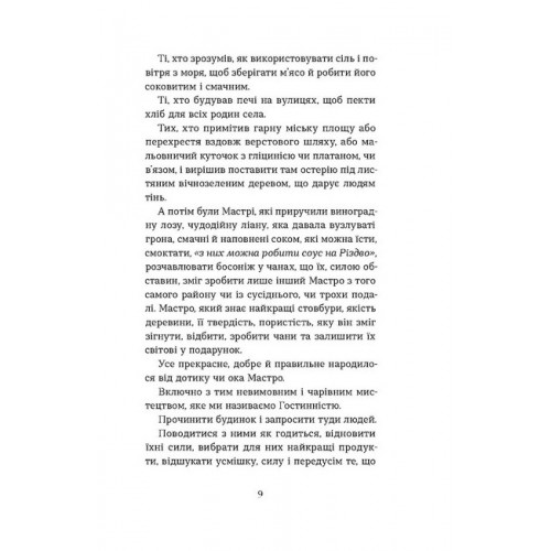 Книжка Марко Черветті — це ода смакам і текстурам, філософії майстрів, які роками вивіряли свої рецепти, та традиціям, що передавалися з покоління в покоління. Марко розповідає історії застіль та ділиться рецептами, дбайливо відібраними ним під час численних мандрів світом, — від українського борщу та цибулевих пиріжків Доброго Да до карбонари римського майстра і кесадильї з Мехіко-сіті.