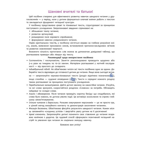 Швидкочитання. 2 клас 978-617-8387-83-9 Посібник створено для учнів 2 класу, які прагнуть удосконалити навички швидкого і свідомого читання. Поступове ускладнення оригінальних текстів сприяє підвищенню темпу читання, розвитку артикуляції та розширенню зорового сприймання. Завдання на глибоке розуміння прочитаного, аналіз змісту, встановлення логічних зв’язків і виявлення прихованих сенсів допомагають сформувати у дитини навички критичного мислення. Творчі вправи мотивують до фантазування, переосмислення тексту та мовленнєвого розвитку. Посібник стане надійним помічником як для самостійного навчання, так і для роботи вчителя на уроці.