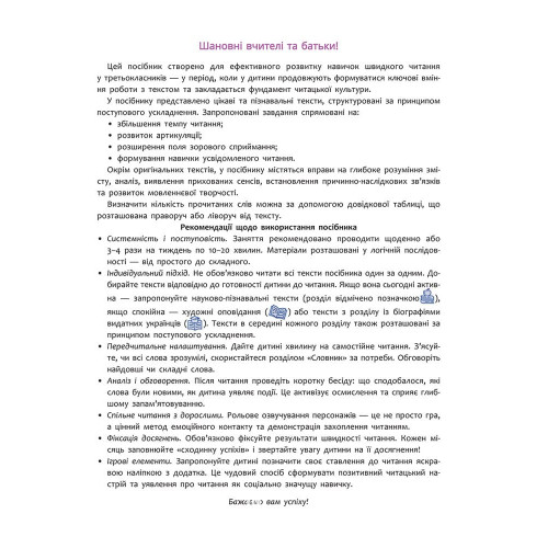 Швидкочитання. 3 клас 978-617-8387-84-6 Посібник створено для учнів 3 класу, які прагнуть удосконалити навички швидкого і свідомого читання. Поступове ускладнення оригінальних текстів сприяє підвищенню темпу читання, розвитку артикуляції та розширенню зорового сприймання. Завдання на глибоке розуміння прочитаного, аналіз змісту, встановлення логічних зв’язків і виявлення прихованих сенсів допомагають сформувати у дитини навички критичного мислення. Творчі вправи мотивують до фантазування, переосмислення тексту та мовленнєвого розвитку. Посібник стане надійним помічником як для самостійного нав­чання, так і для роботи вчителя на уроці.
