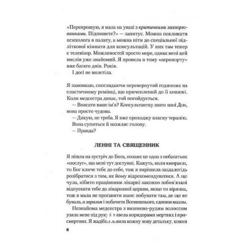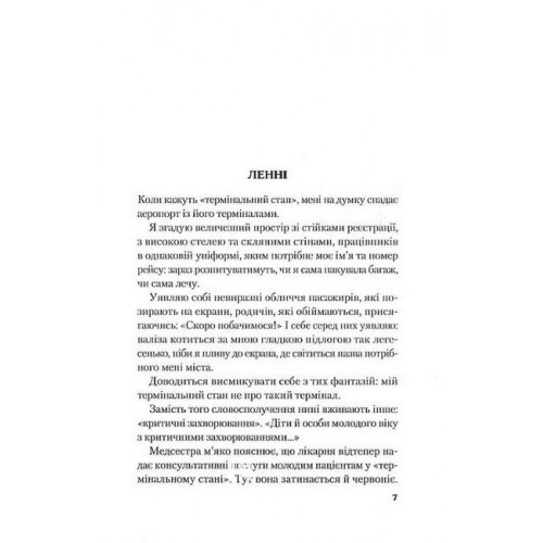 Сто років Ленні та Марго., Мерієнн Кронін 978-966-982-788-3 Сімнадцятирічна Ленні має невиліковну хворобу. У дівчини обмаль часу, так само як і у вісімдесятитрирічної Марґо. Одного разу ці пацієнтки зустрічаються в лікарні, і між ними миттєво виникає зв’язок: підсумовуючи свій вік, вони виявляють, що на двох прожили сто років. Художньо обдарована Марґо змінює погляд Ленні на світ, і подруги вирішують: не важливо, скільки часу їм лишило життя, — вони не згають ані секунди. Жінки намалюють сто картин, у яких відобразять своє «століття» з історіями кохання та втрат, мужності й доброти, з обличчями всіх, кого вони зустріли та не встигли зустріти. Але коли остання картина буде намальована, чи означатиме це кінець?Для пам’яті про життя Ленні та Марґо це лише початок…