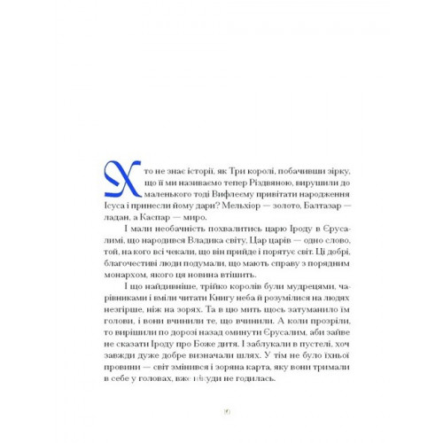 Видавництво "Ще одну сторінку" Три королі повертаються додому. Різдвяні історії для всієї родини., Галина Пагутяк 978-617-522-533-2 Інколи попри вік нам хочеться поринути в загадковий чарівний світ дива. І хоч традиції Святвечора, історія народження маленького Ісуса і ритуали освячення йорданської води нам цілком відомі і не змінюють свого усталеного ходу, та якщо вірити і придивитися, то й серед цих вікових обрядів можна розгледіти справжнє диво. Чи варто боятися мишей, що з’явилися в домі в йорданську ніч? Яку звістку принесе на Святвечір коза? І чи справді на Різдво летючі кораблі спускаються з небес на землю? В усталених традиціях різдвяних свят Галина Пагутяк підмічає тонку незбагненну магію дива і ділиться з читачами часточкою свого Різдва на хуторі.