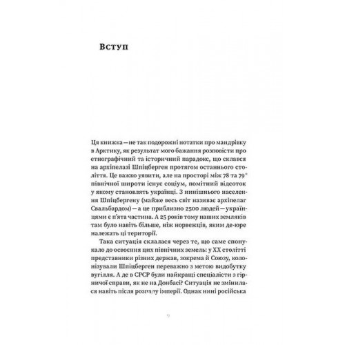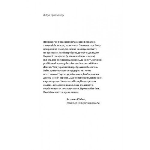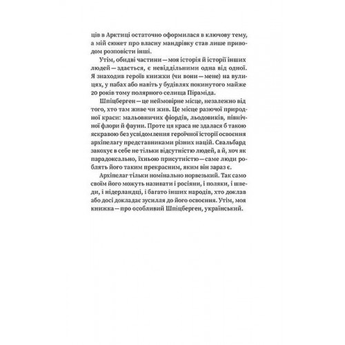 Шпіцберген може бути дуже різним. Може дивувати, закохувати та розчаровувати. У цій книжці Максим змалював історію Шпіцбергену — його минуле, сьогодення та, можливо, навіть майбутнє — через історії українців, яких доля звела з цим місцем. Це історія українського Шпіцбергену.