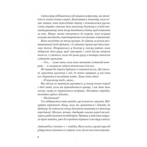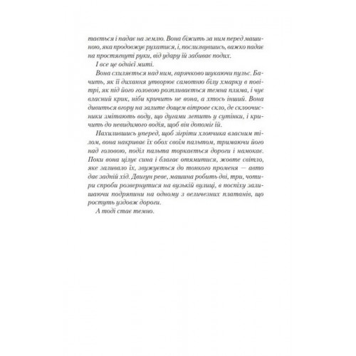 Я дозволила тобі піти., Макінтош Клер 978-617-17-0286-8 Трагічна аварія, у якій гине п’ятирічний Джейкоб, докорінно змінює життя багатьох людей, адже причетні до неї їдуть геть, навіть не зупинившись. Так, з місця події можна втекти, але як утекти від минулого? Це питання не дає спокою ні матері загиблого хлопчика, ні винним в аварії, ні поліцейським, що, розпочавши розслідування, кружляють хибними шляхами. Тільки зупинившись і поглянувши минулому в очі, герої роману отримують те, чого прагнуть: покарання для винних і звільнення від тягаря провини для решти.