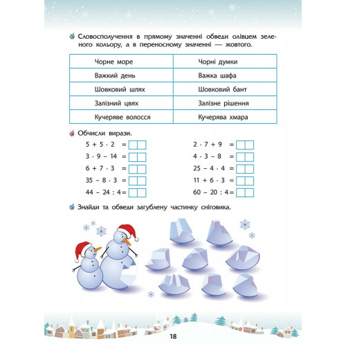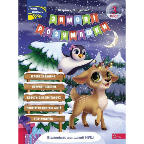 Зимові розумашки. 3 клас, Тетяна Квартник, Олена Шаповал 978-617-8387-47-1 Зимові свята – радісний та щасливий час, коли ми зустрічаємося в затишному колі рідних та друзів. Проте канікули – це також чудова нагода провести святкові дні із користю для навчання. Як без зайвого примусу повторити із школярем матеріал першого півріччя? Як в ігровій формі перевірити результат його попереднього навчання? Як відвернути увагу дитини від гаджетів і зробити новорічні свята більш насиченими? «Зимові розумашки» — це цікавий мікс практичних і творчих завдань. А яскраві подарунки (наліпки, настільна гра-ходилка та карта мрій) допоможуть зробити ваші інтелектуальні ігри більш різноманітними, а може, і започаткують нові традиції у родині.
